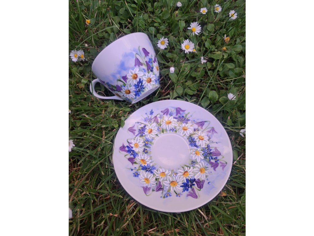 Originálna ručne maľovaná šálka s motívom lúčnych kvetov a zvončekov. Šálka je aj s podšálkou. Vhodná na kávičku na každý deň. Možnosť dopísať venovanie na želanie./uveďte do poznámky v objednávke/. Maľovaná farbami na porcelán, ktoré sú vypálené a odolné. Farby majú certifikát so styk s potravinami. Dodávaná v darčekovej krabičke.